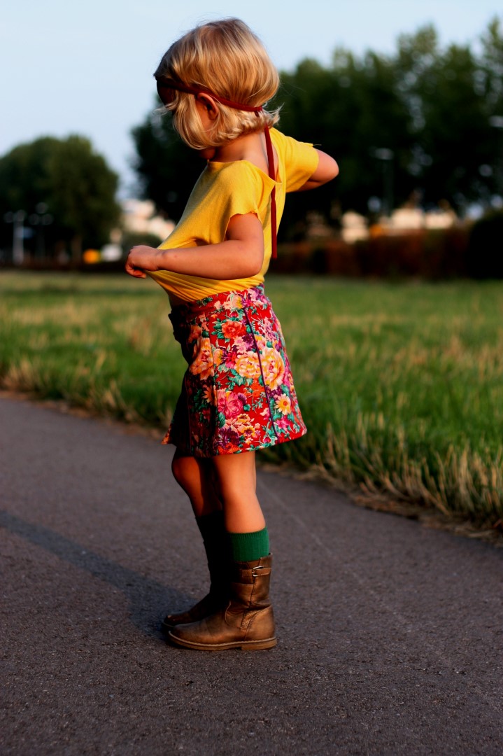 Aangezien het vandaag een werkdag was voor mij, werden de foto's in het avondzonnetje genomen. Warm licht verspreidde zich over dochterlief en haar kleertje. Zo wordt de #sellaskirt niet alleen in de bloemetjes gezet, maar krijgt de outfit ook nog eens een gouden randje!